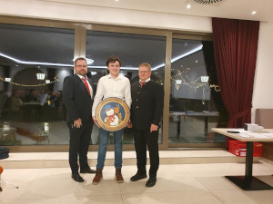 ![]() Maximilian Loureiro mit der Nikolausscheibe überreicht von 2. Schützenmeister Michael Schrödinger (links) und 1. Schützenmeister Albert Weber (rechts) |
